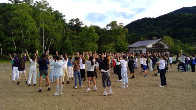 湯ノ湖畔に行き、朝会をしました。今日のめあてを確かめた後、定番のラジオ体操をしました。