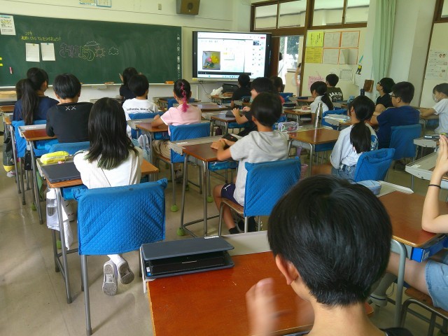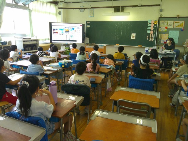 子供たちは、夏休みに自由研究に取り組みました。今日、明日の二日間の朝の時間に、校長室と各学級とをオンラインでつないで、その自由研究の発表集会を行っています。