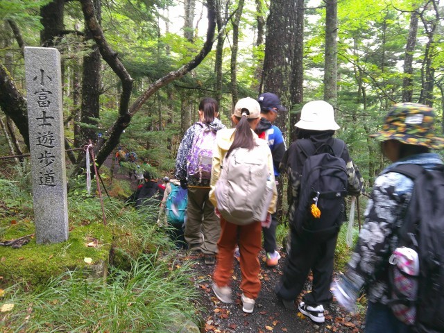 道の駅すばしりで登山ガイドさんに合流し、小富士トレッキングに出かけました。バスの中で、ガイドさんから、富士山の説明やトレッキングの心得をうかがいました。