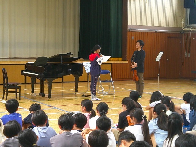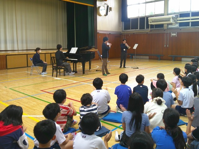 演奏は、本校の音楽専科の伴奏でしてくださいました。とても素晴らしく、クラッシックを身近に感じることができました。途中、6年担任のトランペット演奏が加わる場面もあり、会場はおおいに盛り上がりました。