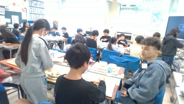 給食の時間には、留学生と一緒に食事をしながら、笑顔で会話を楽しむ様子が見られました。
