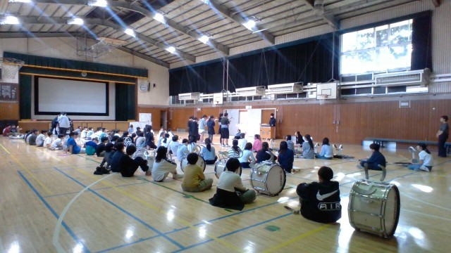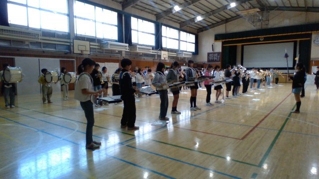 体育館で、パートごとに演奏したり全体で合わせて演奏したりした後、校庭で行進しながら演奏しました。