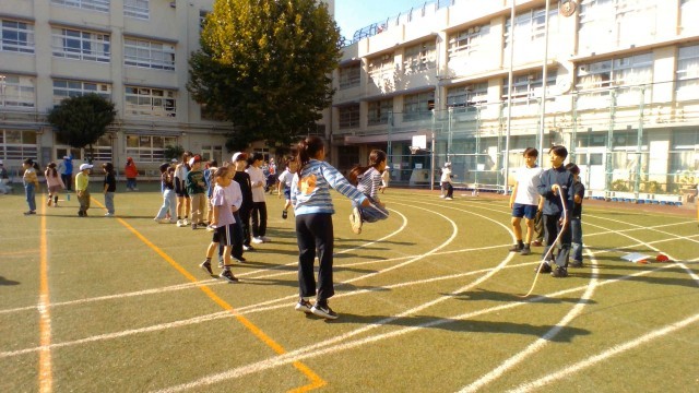 下学年と上学年とで日を分けて、体育朝会をしました。今回は、長縄跳びをしました。