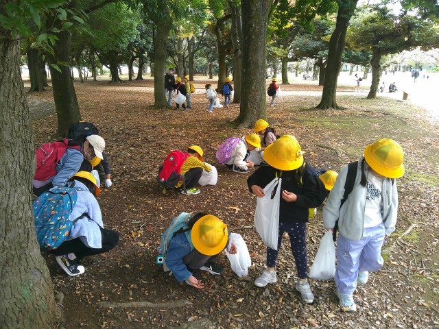 初めての生活科見学のため、安全に気を付けながら行動しました。様々な種類のどんぐりや大きな落ち葉をたくさん見付けて拾ったり、友達とうれしそうに見せ合ったりする姿が見られました。