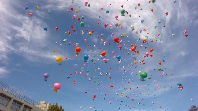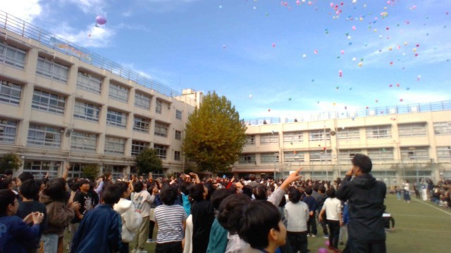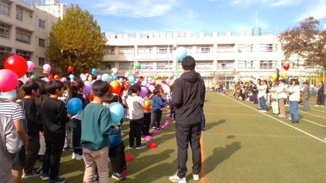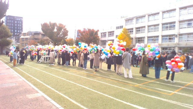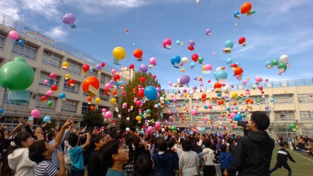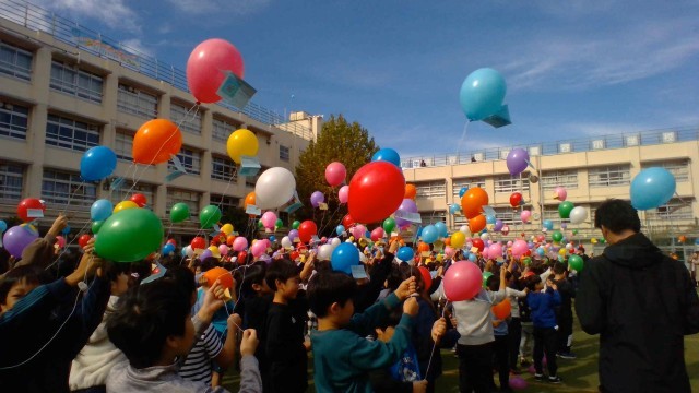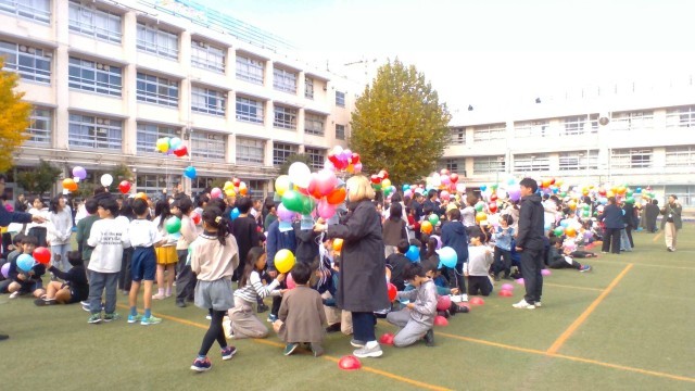 記念集会の後、子供たち一人一人が将来の夢や目標などを書いたカードを付けた風船を飛ばす、バルーン・リリースを行いました。
