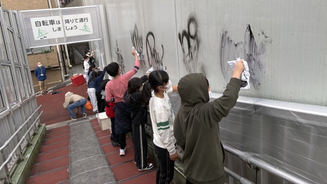 この日は、富ヶ谷の街にある落書きを消して、きれいで安全な街にしたいという願いをもつ児童のグループが、地域の方にご協力いただき、街の落書き消しを行いました。
