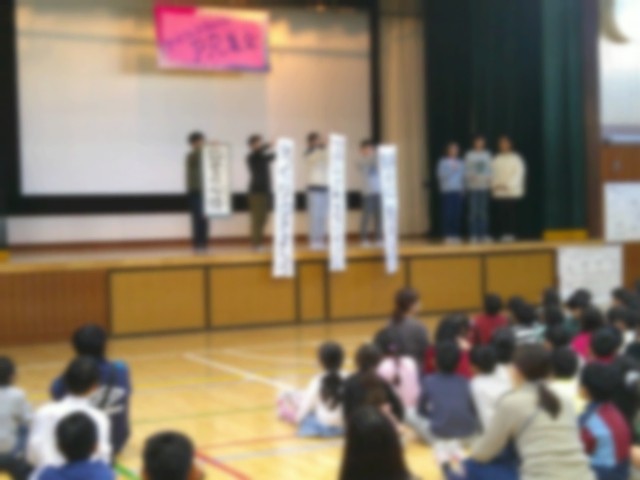各学年の代表児童がアートフェスティバルに出展する作品の見どころを全校児童に紹介しました。