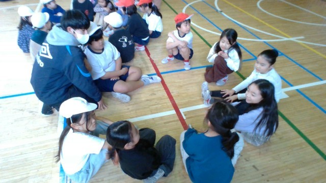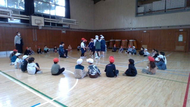 後半は、サークルダンスをしました。輪になって回った後、太鼓の音がなった数だけ仲間を集めて座りました。そのあと、好きなものを伝え合う自己紹介もして互いのことを知り合いました。