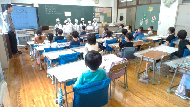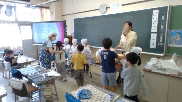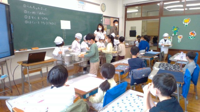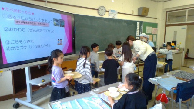 手の洗い方や身支度の仕方を確認した後、いよいよ、給食の準備です。給食当番の児童が食缶の前に立ち、こぼさないように気を付けながら配膳していました。そして、食べるときには、ご飯粒を残さないようにスプーンで集めて、きれいに食べていました。片付けも自分たちで行います。