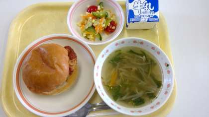 夏休み明け初日の給食です。配膳しやすいように、パンにコロッケをはさんで配缶しました。