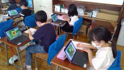 富谷小学校の1年生の花壇では、ヒマワリやマリーゴールドなどの植物を育てています。先日はタブレットを使って、9月の花壇の様子を写真を見ながら観察をしました。様々な角度から撮った花や実の写真を見て、色や形に注目しながら観察カードに書くことができました。