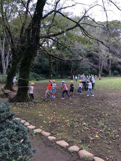 写真にあるように、今、子供たちは駒場公園で縦割りグループごとで遊んでいます。今日のように今後も外で思い切り遊ばせてあげられる機会を作っていきたいです。