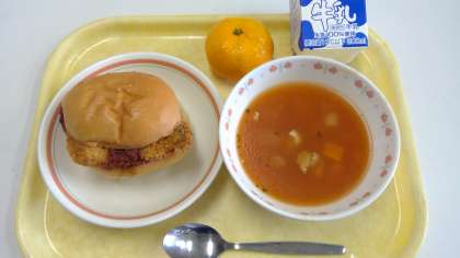 『フィッシュバーガー好き!』と給食当番さんが教えてくれました。カラッと揚がった魚のフライとパンの相性は抜群、ほとんど残りはありませんでした。