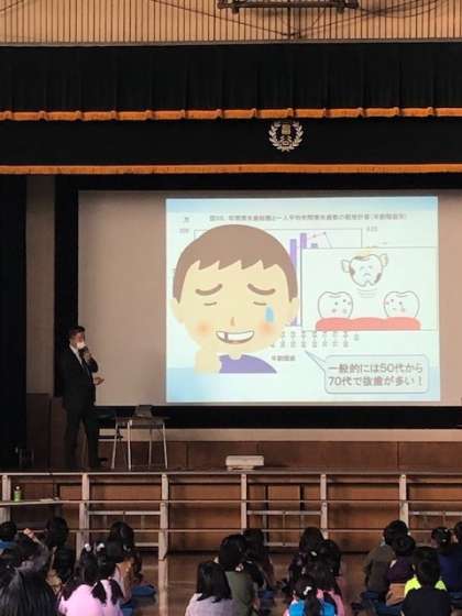 1年生の歯科指導は、校医さんが画面を使って分かりやすく教えてくえました。「歯の染め出し」による歯垢の確認学習は、コロナ禍が終わってからになりそうです。