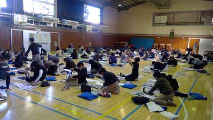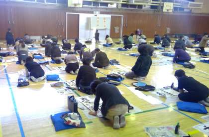 1月12日に体育館で書初め会を行いました。5年生は、「新春の光」「希望の朝」のどちらかを書きました。文字のバランスに気を付けたり、お手本をよく見ながら太さや長さ等細かいところを意識して書いたりと一人一人が気を付ける点を明確にして書初め会に臨みました。時間いっぱいまで粘り強く取り組み、力強い作品が出来上がりました。