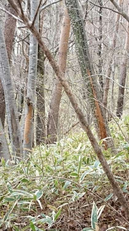 写真は、沢歩きコースのハイキングの途中で写したものです。木の皮が食べられているところがありました。鹿が食べたのでしょうか。