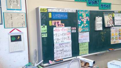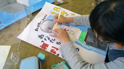 5年生は、図画工作の時間に選挙のポスターを描いています。