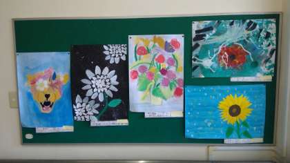 校内のあちらこちらの掲示板に、6年生が図画工作の時間に描いた作品「感じたままに花」が展示されています。
