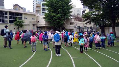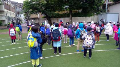 こどもの森でたっぷりと遊び、帰りのバスに乗るころに雨が降り始めましたが、学校に着くころには上がり、校庭で帰校式をすることができました。