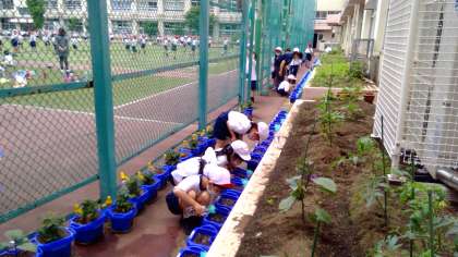 1年生は、生活科の時間にアサガオの種をまいています。