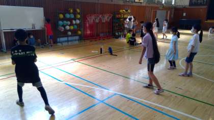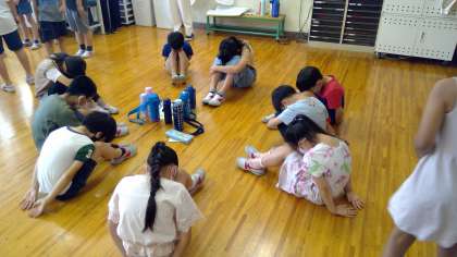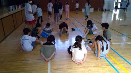今朝は、3年生と5年生とのなかよし班活動がありました。朝から暑かったため、校庭ではなく、体育館や教室で行いました。