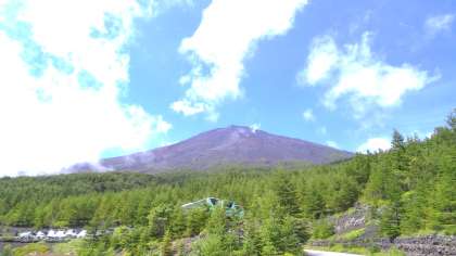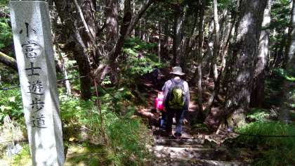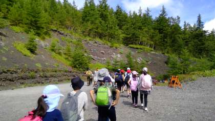 ここから、山歩きのガイドさんの案内のもと、小富士のトレッキングに出かけます。駐車場を出発するときに、ちょうど雲が切れ、富士山がくっきりと見えました。