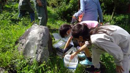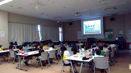 その前に、敷地内にあるビオトープを見に行きました。初めに、富士山周辺の環境や、動植物との共存・共生について、スライドを見ながら学びました。