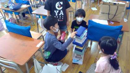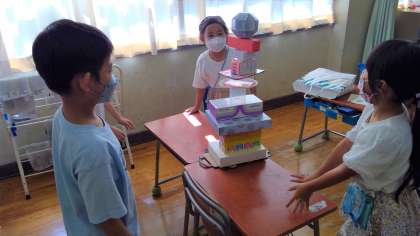 様々な形の箱を組み合わせて、グループの友達と積み上げました。積み上げることを通して、どんな特徴の箱が積み上げやすいのか、グループの友達と相談して、楽しみながら考えることができました。