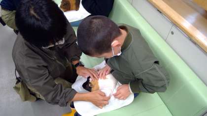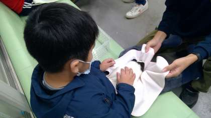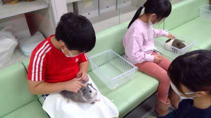 モルモットの食べ物やふん、抱き方を教えていただき、一人一人抱っこしました。