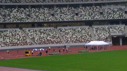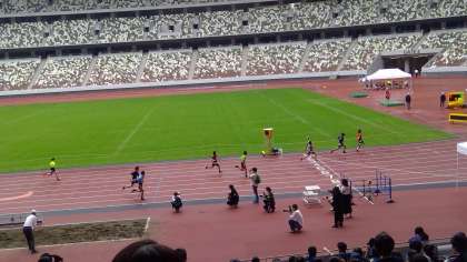 記録会最初の種目は、100m走です。メインスタンドの前で行われました。たくさんの拍手による応援の中、出場した子供たちは、全力で疾走していました。女子の部では、富谷小の児童が、大会新記録を更新しました。