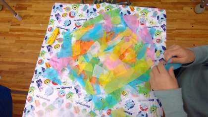 薄いおはな紙の感触を楽しみながら、手で破いたり、はさみで切ったりしました。切ったおはな紙を並べたり、重ねたりすると、きれいな模様が出来上がります。思い思いに重ねたおはな紙に薄めた洗濯のりをかけて乾かしました。