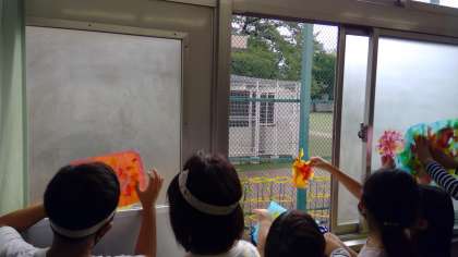窓に貼ったり、明かりに透かして見たりして、「すごくきれい!」「いろんな色が重なってる!」と大盛り上がりの子供たちでした。