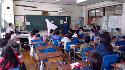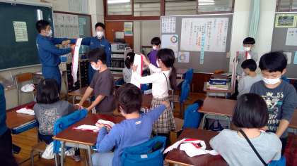 三角巾の巻き方を子供たちに分かりやすく説明していただきました。貴重な体験をありがとうございました。
