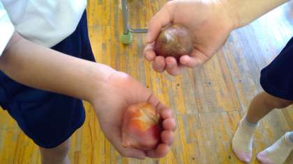 一生懸命育てたアサガオをリースにして、次はチューリップの球根を植えることになりました。アサガオの種とチューリプの球根を比べて、大きさの違いにびっくりしていました。