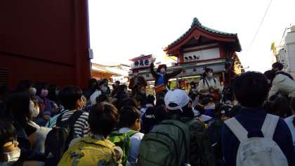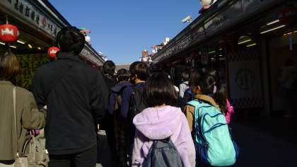 4年生は、社会科見学で浅草に行きました。乗車予定の貸し切りバスが事故渋滞に巻き込まれたため、出発が少し遅れましたが、無事に浅草に到着しました。