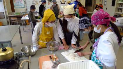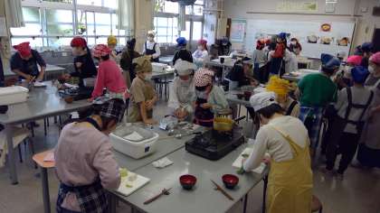煮干しでだしを取る、野菜を切る、お湯を沸かす、味噌を溶く…。一品の料理を作るのにも様々な工程があることを知りました。包丁を持つ手から緊張が伝わってきました。グループの友達と楽しそうに実習をしていました。