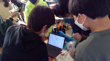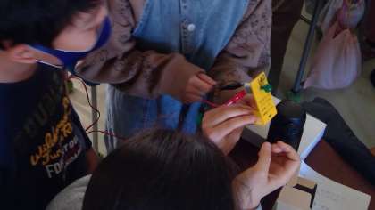 手回し発電機を回す回数や速さを一定にして、豆電球や発光ダイオードに明かりをつけたりオルゴールを鳴らしたりする実験に取り組むグループや、明かりをつけるものや音を鳴らすものを一定にして、手回し発電機を回す回数や速さを変えて発電量を比べるグループなどがありました。