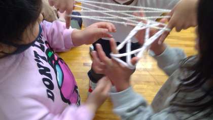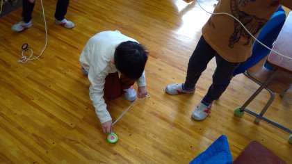 1年生は、生活科の時間に昔遊びをしていました。来週、近隣の保育園や幼稚園に通う園児の皆さんを迎えて、遊び方を教えたり一緒に遊んだりする計画も立てています。