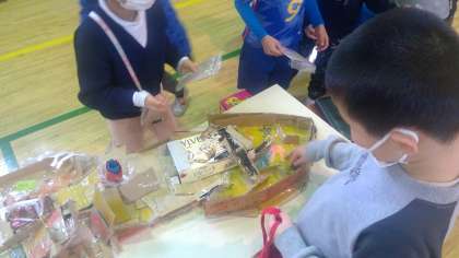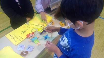 体育館にいずみ学級と1年生が招待され、6つのコーナーの中から遊びたいおもちゃを選び、グループごとに分かれて回りました。ゴム鉄砲でゴムを飛ばして遊んだり、魚釣りで高得点を取ったり、ビー玉を転がして迷路を進んだりと、どのコーナーのおもちゃもとても工夫がされていて、充実した1時間を過ごすことができました。