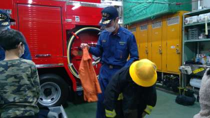 消防署に着くと、一人ずつ事前に考えてきた質問をしました。消防署の方が丁寧にいろいろと教えてくださいました。その後、消防車の中がどのようになっているのかを見せていただいたり、防火衣の早替えを間近で見学したりしました。実際に防火衣や活動服をお借りし、それぞれ着てみたい服を着用して充実した時間を過ごすことができました。