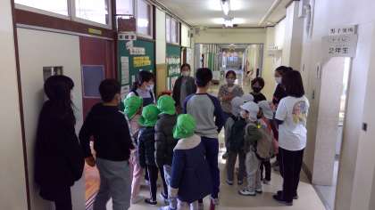 5年生が一緒に校舎内を回り、保健室、職員室、理科室などの教室を紹介しました。グループごとに説明をしながら歩いている姿はとても微笑ましかったです。5年生にとっても6年生に進級する気持ちを高める良い機会となりました。