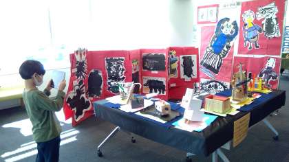 初めに、自分の作品を確認し、その後、みんなで全体を観て回りました。好きな作品を見付けたり、上手な作品に驚いたりしながら観て回っていました。作りたい作品を見付けた人もいました。