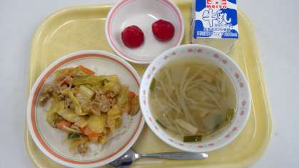 ・回鍋肉丼 ・ビーフンスープ ・いちご ・牛乳