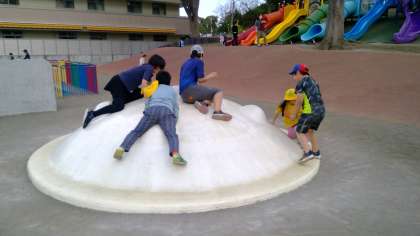 午後は、しながわ区民公園に行きました。ターザンロープやローラー滑り台、ロッククライミングなど、たくさんの遊具があり、たっぷりと遊びました。