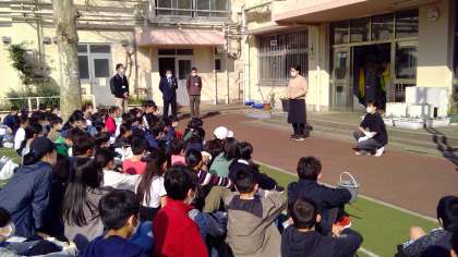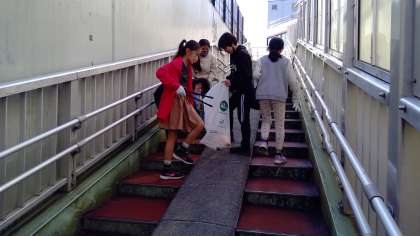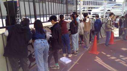 学校を出発する前に、渋谷区の担当課の方から子供たちに励ましの言葉をいただきました。その後、現地に行き、アミイゴさんに作業の仕方や通行の方への配慮についてレクチャーしていただいてから作業を始めました。2時間取り組み、ずいぶんときれいになりました。また、作業の間に、近くのごみ拾いも行いました。