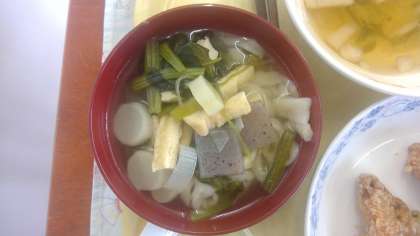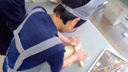 前日にみんなでこねたうどん生地を包丁で切り、畑で育てた冬野菜を混ぜてけんちんうどんができました。自分たちでこね足でよく踏んだうどんは、こしがありもちもちとした歯ごたえで、「おいしい!」「おかわりしたい!」という声がたくさん聞こえました。