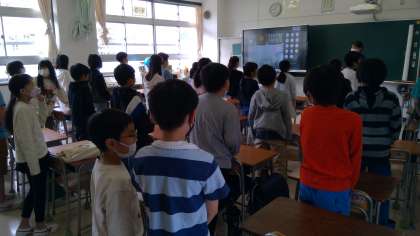 朝、ぽつりと雨があたったため、始業式はオンラインで行いました。各学年の子供たちに向けてこの1年間に頑張ってほしいことを話した後、新しく着任した先生たちを紹介しました。先生たち一人一人が挨拶をすると、教室から拍手が聞こえてきて、とても温かい雰囲気になりました。