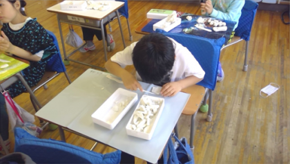 粘土を握ったり、ねじったりすることで、粘土のかたまりを体全体で楽しむことができました。思い思いの作品をつくり、つくった作品をみんなで見合いました。友達の作品の良いところをたくさん見付けていました。