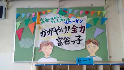 児童朝会のときに、代表委員からスローガンの発表もありました。健康や安全に気を付けながら、全校のみんなで楽しい「富谷スポーツフェスティバル」をつくっていきます。