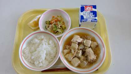 ・ごはん ・肉豆腐 ・じゃこ入りサラダ ・美生柑 ・牛乳